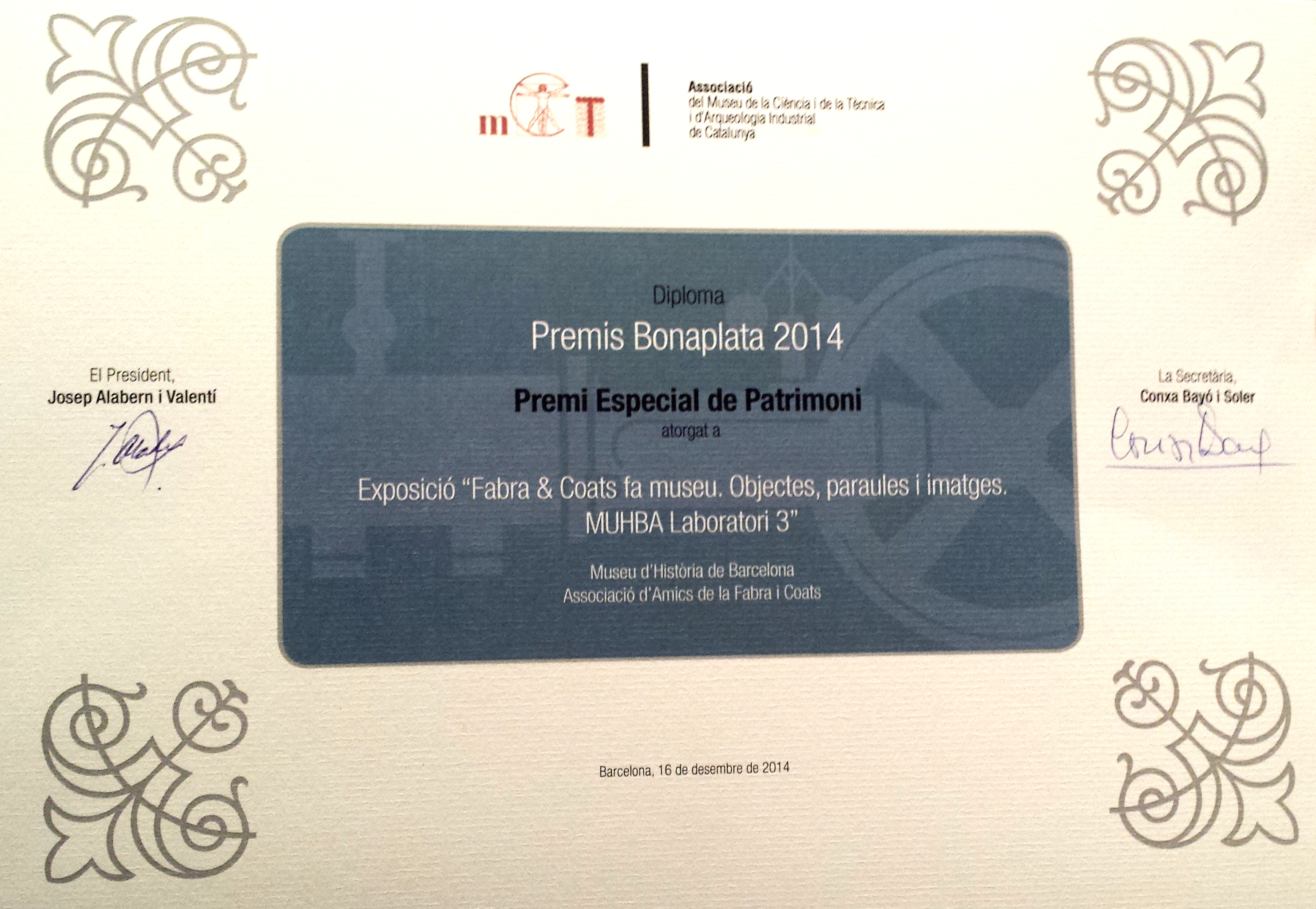 Premi Bonaplata a l’exposició “Fabra i Coats fa museu” L’exposició “Fabra i Coats fa museu. Objectes, paraules i imatges”, organitzada pel Museu d’Història de Barcelona, ha obtingut el Premi Bonaplata 2014 en la categoria Premi Especial de Patrimoni, en la modalitat de difusió. Aquesta exposició, que es va inaugurar el 9 de maig del 2014 i es va poder visitar fins el 12 d’octubre a l’espai Joan Bota de l’antiga fàbrica Fabra i Coats de Barcelona, oferia un punt d’encontre entre el patrimoni cultural moble i immoble, la historiografia i les arts en la construcció del llegat històric de la ciutat, a partir dels nombrosos objectes i documents escrits i gràfics de l’antiga empresa Fabra i Coats. ![]() “Fabra i Coats fa museu” ha sigut una exposició organitzada pel MUHBA, comissariada per Xavier Cazeneuve (Barchinona.cat) i que va comptar amb l’assessorament històric de Pere Colomer, la recerca fotogràfica de Marta Delclòs, el disseny de Marta Galí i Marta Oristrell, la documentació de Gerard Cunill i amb la col·laboració de l’Associació Amics de la Fabra i Coats. El premi va ser concedit Ex-Aequo amb l’exposició “Sant Adrià, la fàbrica de la llum”, del Museu d’Història de la Immigració de Catalunya, comissariada per Francesc Muñoz i Jaume V. Aroca. Accediu al dossier de prensa de l’exposició “Fabra i Coats fa museu”, clicant aquí. |