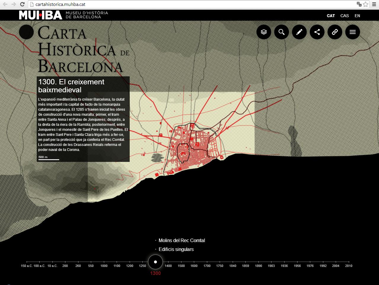 Carta Històrica de Barcelona El Museu d’Història de Barcelona (MUHBA) ha creat un nou recurs divulgatiu per conèixer l’evolució urbanística de la ciutat de Barcelona: la Carta Histórica de Barcelona. En una adaptació als nous temps d’un atles històric de Barcelona actualitzat o de la presentació audiovisual de la pròpia exposició permanent del MUHBA, la Carta Històrica de Barcelona és una transcripció cartográfica de l’evolució del creixement de la ciutat a partir de mapes històrics originals, que podem consultar, i gaudir, des de casa. A través d’aquest recurs podem veure com ha crescut i com ha canviat la fesomia de Barcelona al llarg de 22 segles, alhora que podem gaudir de diverses capes d’informació específica, com les de nuclis poblats, edificis representatius, molins, fabriques o xarxes de transports. Un conjunt de gràfics plens de detall acompanyats de textos breus, plens de concisió i rigor, que constitueixen una reconversió cartográfica que vol traçar un discurs històric de llarga durada. Segons el MUHBA, es tracta d’un recurs docent «per a tots els divulgadors, tècnics municipals i professors que vulguin explicar la seva aproximació histórica a la ciutat amb les eines més actuals». Consulteu aquest recurs divulgatiu clicant en aquest enllaç. |