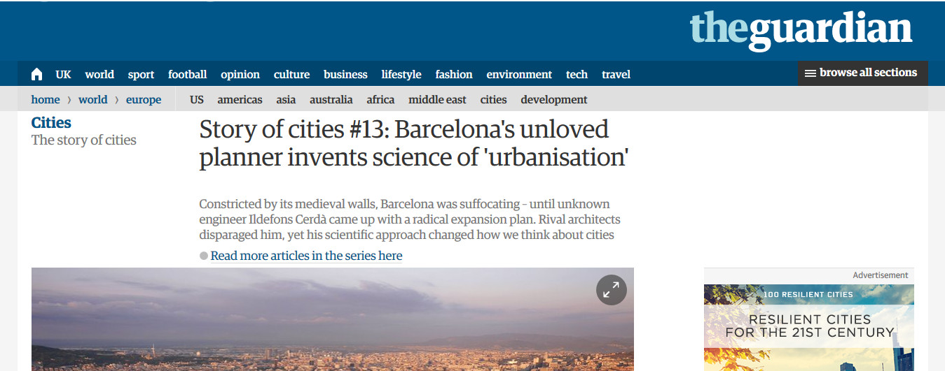 The story of cities Des del 14 de març, el diari anglès The Guardian publica una sèrie de reportatges amb el títol “The Story of Cities”, en els que repassa diversos moments cabdals en la història de les grans ciutats del món. Articles dedicats a Alexandria, Roma, Bagdad, Beijing, Filadèlfia, Sant Petersburg, París, Londres, Rio de Janeiro, Viena, Johannesburg... L’article dedicat a Barcelona, publicat l’1 d’abril i signat per Marta Bausells, es titula “Barcelona's unloved planner invents science of 'urbanisation'” i està dedicat a l’urbanisme d’Ildefons Cerdà i a la importància i influència de les seves aportacions en la ciutat. De debò que us recomanem llegir tota la sèrie completa! |