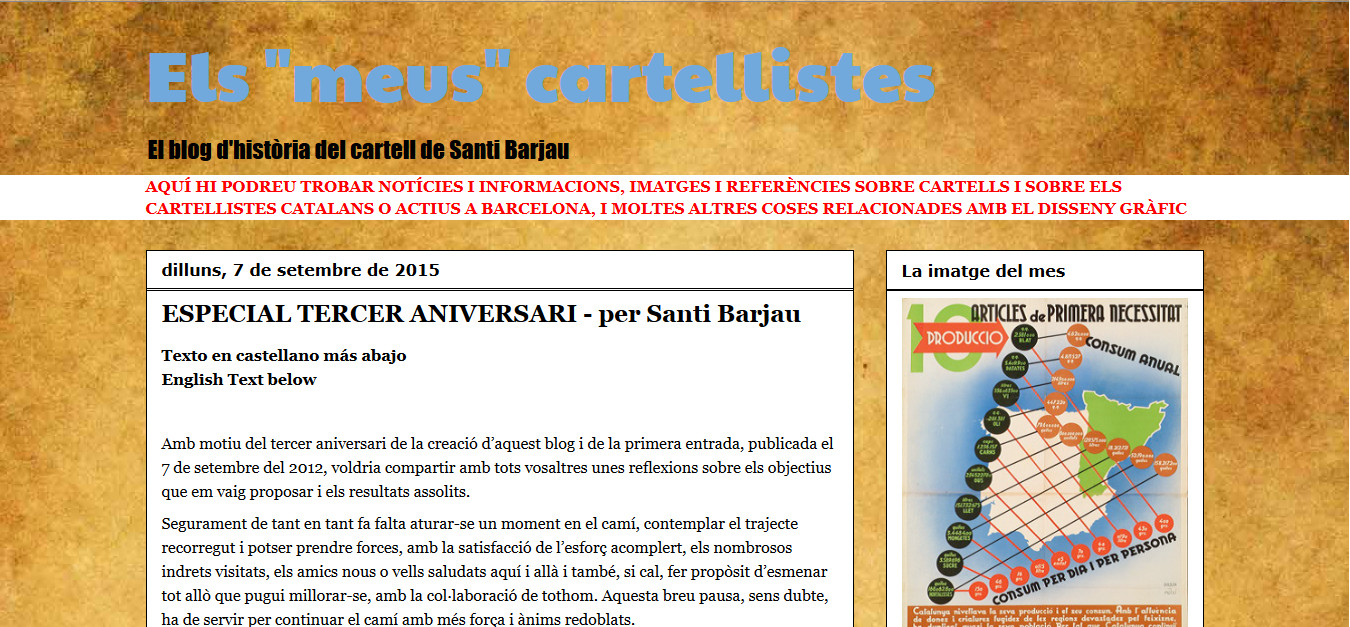 Felicitats a “Els meus cartellistes” pel seu tercer aniversari! Celebrem que el 7 de setembre va fer 3 anys que va sortir a la llum “Els meus cartellistes”, un blog especialitzat en informacions, imatges i referències sobre cartells i cartellistes catalans o actius a Barcelona, a més d’altres notícies sobre disseny gràfic. “Els meus cartellistes” és obra de Santi Barjau, doctor en Història de l’Art i conservador del Departament de Gràfics de l’Arxiu Històric de la Ciutat de Barcelona, que a més de ser un erudit en la matèria sap com divulgar el seu coneixement d’una manera clara, entenedora i atractiva. Des de Barchinona.cat felicitem a “Els meus cartellistes” pel seu tercer aniversari i, naturalment, us en recomanem la consulta. |